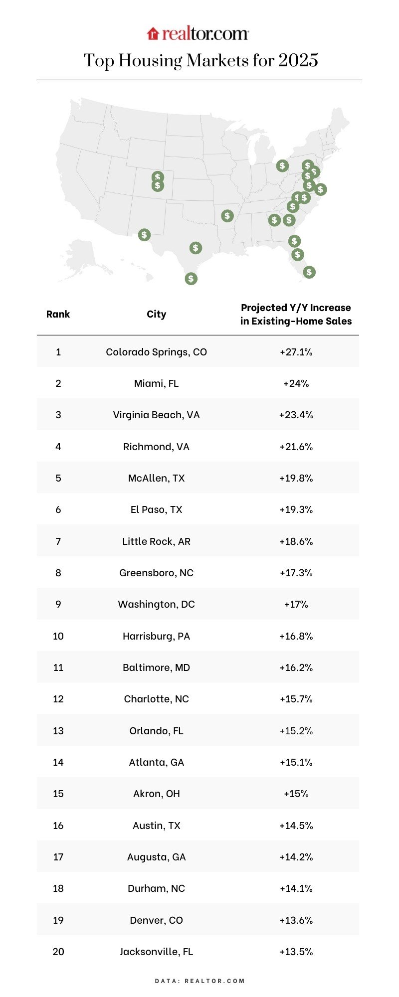 “A lot of the top markets for growth in 2025 have an outsized share of foreign-born residents,” says Realtor.com Chief Economist Danielle Hale. “The No. 1 market, Colorado Springs, is an exception; but Miami, El Paso, Orlando, and McAllen all have higher shares of foreign-born citizens.”